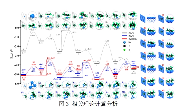 密度泛函理论(DFT)计算结果表明每个全暴露的团簇内邻近Ru原子之间的协同作用促进了反应物的活化和产物的脱附,且在全暴露的Ru团簇上甲苯多步加氢反应的总能垒明显低于单原子和纳米颗粒催化剂,从而使其具有更高的活性。本工作对调控催化剂的尺寸、设计全暴露金属团簇催化剂用于甲苯多步加氢反应提供了重要的理论与实验基础。