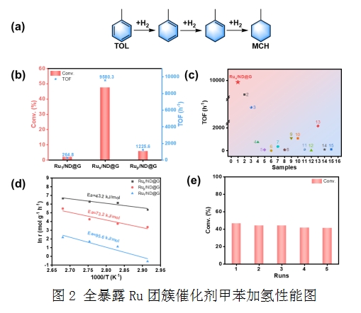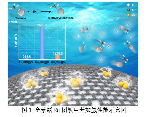 “双碳”目标呼吁着各行各业都要减少二氧化碳的排放量,这对传统的石油能源领域更有着严格的要求。为了顺利过渡到能源低碳化、无碳化,发展更清洁的能源迫在眉睫。而液态有机储氢(LOCHs)能够在温和的温度下释放氢气,并且具有安全、高效运输氢气的优点而备受关注。液态有机氢载体在氢能的存储和应用领域具有重要意义,甲苯能够通过多步加氢还原为甲基环己烷,其具有毒性较低和氢存储能力较高的优势,故作为液态有机氢载体受到广泛研究。Ru等贵金属具有优异的加氢催化活性,但是价格昂贵且原子利用率低,阻碍了其应用。因此,发展具有高活性和高原子利用效率的贵金属催化剂成为巨大的挑战。