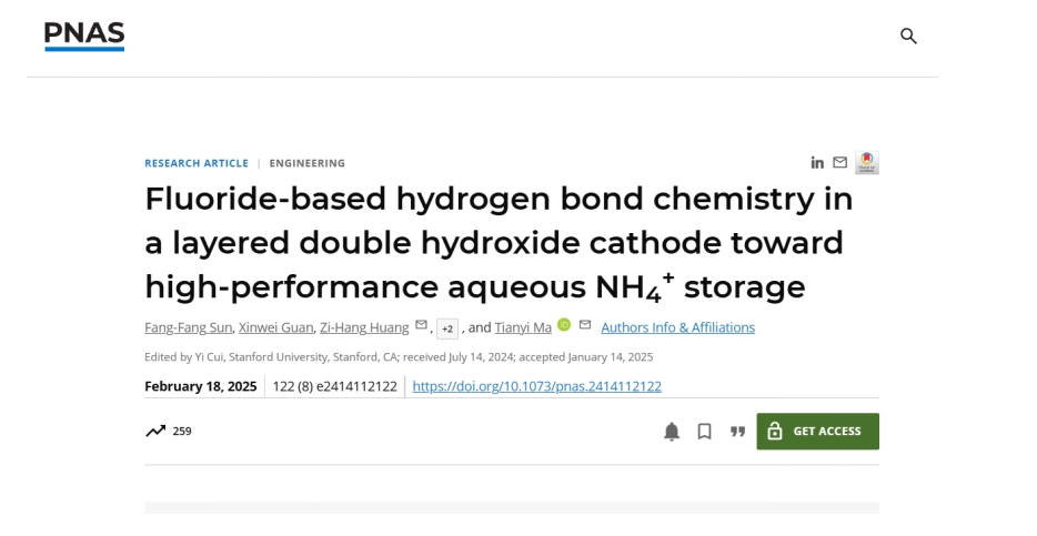 近日,威廉希尔体育教师黄子航在水系铵离子存储的研究中取得新进展。相关成果以“Fluoride-based hydrogen bond chemistry in a layered double hydroxide cathode toward high-performance aqueous NH4+ storage”为题,发表在国际顶级期刊《美国国家科公司院刊》(简称PNAS)上。文章第一署名单位为WilliamHill官方网站,黄子航副研究员为通讯作者,威廉希尔体育博士生孙放放为第一作者。