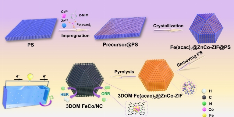 发展绿色能源是解决传统化石能源带来的问题的关键。电催化水分解、燃料电池和金属-空气电池是重要的能量转换和存储技术。析氢反应(HER)、氧还原反应(ORR)和锌-空气电池等电化学反应都需要高性能催化剂来提高反应效率。然而,目前应用最广泛的HER、ORR催化剂和锌-空气电池正极材料仍然是Pt基材料,但其发展受到成本高、丰度低等条件的限制。在非贵金属中,Fe-Co双过渡金属已被证明有希望用于HER和ORR。沸石咪唑酸框架(ZIFs)具有独特的掺杂能力和含氮配体,热解后可转化为金属位点锚定的氮掺杂碳,是电催化剂的优良前驱体。然而,ZIFs衍生材料具有无序的微孔,这往往会阻碍电解质在催化剂内部的传质,限制了内部活性位点的利用。为了解决这些问题,在这篇论文中,设计了一个三维有序的大孔CoFe2O4/CoFe纳米颗粒负载氮掺杂碳作为ORR和HER的催化剂。以聚苯乙烯微球为模板,制备了具有互联介孔的三维有序大孔催化剂。负载的CoFe2O4/CoFe异质结构通过强电子相互作用,优化氧中间体吸附与质子传递路径,显著降低反应能垒。这种开放式三维形貌增强了电解质分子的传质能力,大大提高了催化剂内部活性位点的利用率,显著提高了催化活性。在碱性HER催化过程中,电流密度为10 mA cm-2时的过电位为96 mV。在大电流密度(> 235 mA cm-2)下的催化性能优于商用Pt/C。在碱性ORR催化中,半波电位高达0.896 V。进一步组装成锌空气电池,峰值功率密度为163 mW cm-2,比电容达到815 mAh g-1。这项工作通过分层孔隙工程和双金属协同来设计多功能电催化剂,为能量转换和存储技术提供了新的思路和方法。